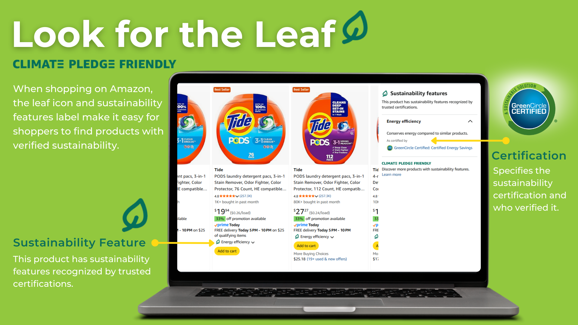 Climate Pledge Friendly collaborates with trusted third-party certifications to highlight products that meet sustainability standards and support Amazon’s commitment to help create a positive sustainability impact.